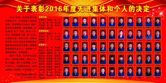 2016年度,在全體員工的共同努力下,公司取得了較好的業(yè)績(jī):年銷(xiāo)售加工Φ8mm銅桿、各類(lèi)規(guī)格裸銅線、鍍錫銅線、束絞銅線65.7萬(wàn)噸,增長(zhǎng)5%;2016年銷(xiāo)售收入超167億元。為表彰先進(jìn),推動(dòng)工作,公司決定對(duì)在2016年度中取得顯著成績(jī)的各類(lèi)先進(jìn)予以表彰。希望受到表彰的先進(jìn)個(gè)人,在新的一年里再接再厲,再創(chuàng)佳績(jī)。新的一年里,公司號(hào)召全體員工,以先進(jìn)為榜樣,踏實(shí)工作、努力創(chuàng)新,踐行工業(yè)理想,以客戶為中心,以品質(zhì)為根本,為創(chuàng)建國(guó)際一流銅加工企業(yè)而奮斗。優(yōu)秀中層:盧斌聲、楊?lèi)?ài)民、殷 杰、施嘉、薛鋒、劉立明 萬(wàn)志新、駱駿、朱培飛、蔣福良、駱品其 優(yōu)秀班組長(zhǎng):朱國(guó)新、駱康平、李 明、陳傳松、周 歡、莊立中 張益琴、劉 杰、王志超、王春龍 優(yōu)秀員工:朱洪星、蔣濤、高永新、陸蘇云、韓志同、史利超儲(chǔ)建明、楊明雨、宗健、戴玉龍、 高歡保、蔣黎明曹志彬、羅祖國(guó)、吳小強(qiáng)、何亞濱、宗曉萍、莊年芬李常龍、譚春香、楊榮波、趙江來(lái)、焦春花、唐后東 儲(chǔ)志敏、曾棟強(qiáng)、駱 波、吳燕、駱 靜、李方海 蔣銀飛、董麗娟、丁志兵、儲(chǔ)祥妹