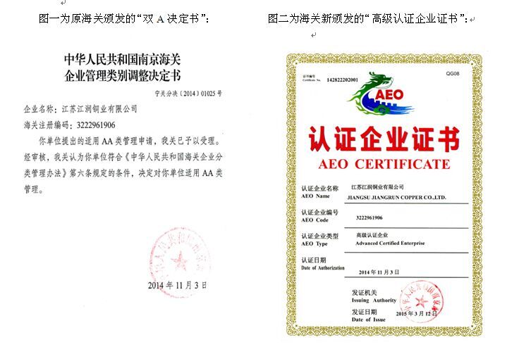 2015年7月30日,由無錫關(guān)檢貿(mào)組織的“共創(chuàng)共建”啟動儀式在無錫隆重舉行,參會企業(yè)共十五家。會議議程為原無錫市15家海關(guān)AA類管理的企業(yè)直接過渡為海關(guān)高級認證企業(yè)。江蘇江潤銅業(yè)有限公司榮獲由南京海關(guān)頒發(fā)的“高級認證企業(yè)”的稱號,公司總經(jīng)理駱偉棟參會并領(lǐng)獎。《中華人民共和國海關(guān)企業(yè)信用管理暫行辦法》去年12月1日實施后,海關(guān)注冊企業(yè)的管理類別從原來的AA、A、B、C、D類劃分,改為按企業(yè)信用狀況劃分為認證企業(yè)、一般信用企業(yè)和失信企業(yè),其中認證企業(yè)又分為一般認證企業(yè)和高級認證企業(yè)。認證企業(yè)在通關(guān)時適用較低的貨物查驗率,單證審核程序相對簡化,并可以優(yōu)先辦理海關(guān)通關(guān)手續(xù)。 高級認證企業(yè),除享有一般認證企業(yè)的通關(guān)便利外,其進出口貨物在確定商品歸類、原產(chǎn)地確定、海關(guān)估價和辦結(jié)其他海關(guān)手續(xù)前可先行驗放,由海關(guān)統(tǒng)一設(shè)立協(xié)調(diào)員,提供便捷通關(guān)服務(wù)。走出國門后,高級認證企業(yè)更可享受與中國實現(xiàn)AEO互認國家或地區(qū)海關(guān)提供的通關(guān)便利,這相當于直接獲得一張在全球有關(guān)國家或地區(qū)快速通關(guān)的VIP卡。